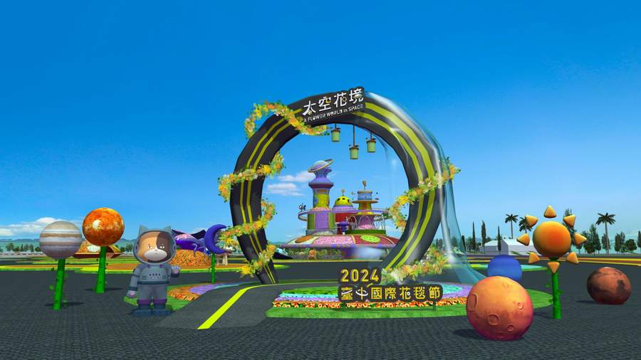 觀旅局長陳美秀表示,主花毯「太空花城」創新突破,打造總高17米,55米直徑寬的神秘太空總部,展現歷年來最多的7個機械動態,每當整點展演時,會出現神秘客蒞臨花城,於太空軌道上帶領地球人來到全新的未知太空世界,一同感染花城的繽紛;走進「環環相扣」象徵踏上永續探險旅程;「蟲獲新生」為一隻巨大的獨角仙,翅膀上結合人造衛星葉片,快樂地漫遊穿梭在太空銀河裡;「時光隧道」外觀為巨大的太空香菇包造型,下方黑洞藏身神秘萬花筒,走入彷彿可引領前往未來世界;「探索未來」坐落於玉米田中,駕駛員是來自未來的神秘小貓太空人,帶領著大小朋友一同到展區各處遊歷。