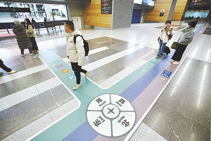 為便利旅客快速到達目的地,豐台站南樞紐內還增設「跑道式地標」,全程引導旅客高效換乘地鐵、出租車、網約車與公交車。(孫宏陽/文 安旭東 北客端/攝)