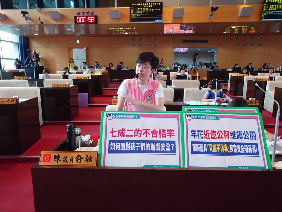 【記者官達里/台中報導】台中市議會今(23)日審議市府113年總決算,根據審計報告指出,市府持續辦理兒童遊戲場設施定期檢驗,惟近3年度(111至113年度)檢驗不合格率高達72.07%。市議員陳俞融指出,市府推動「美樂地計畫」,改善公園綠地,立意良善,但是,光鮮亮麗的口號背後,隱藏著令人無法接受的真相。根據審計處的報告,市府為孩子們打造的遊戲空間,竟然充滿了安全隱患。