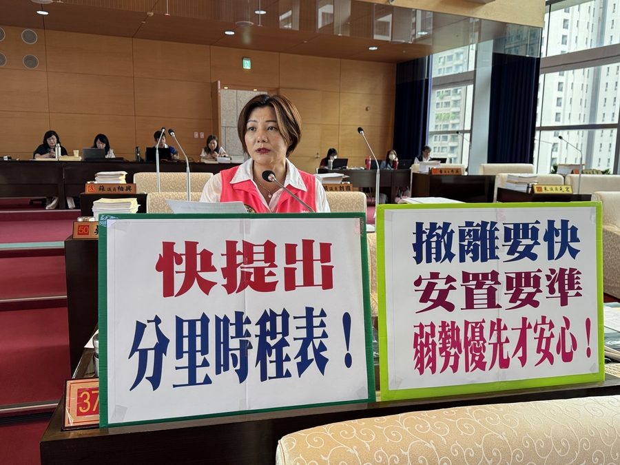 另外,針對花蓮風災造成重大死傷,陳雅惠質疑,萬一台中發生重大災害,撤離動線、安置點真的規劃好了嗎?像東信里、樹義里這些大里,人口龐大又長者眾多,鄰長人力有限,黃金時間要怎麼確保弱勢能優先撤離?市府是否有「名冊化」掌握?宗教團體、替代役能否在撤離階段就加入?跨局處演練到底有沒有落實?