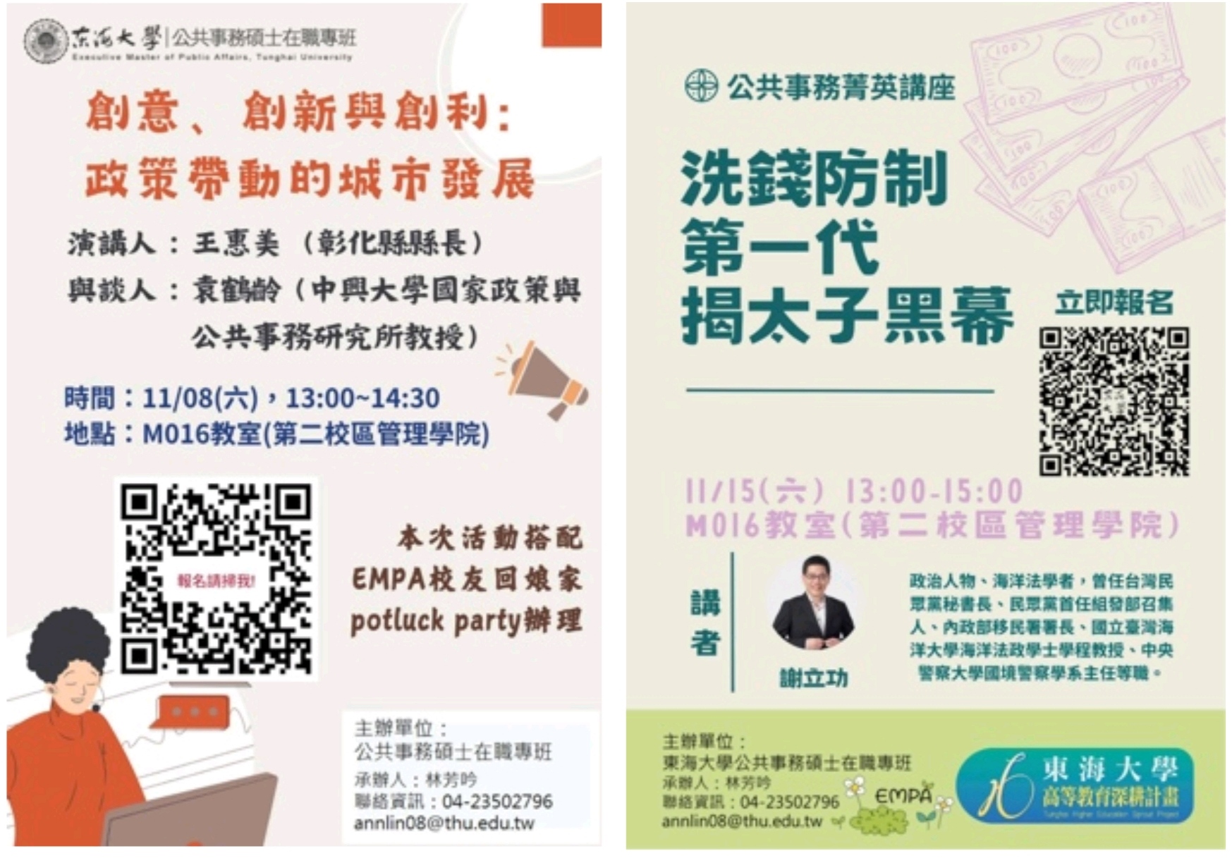 第一場於11月8日舉辦,由彰化縣王惠美縣長以「創意、創新與創利」為題,講述彰化縣府團隊如何以政策帶動城市發展。第二場於11月15日辦理,由前移民署署長、前民眾黨秘書長謝立功教授主講,針對「洗錢防制」議題提出精闢的政策分析與經驗分享。