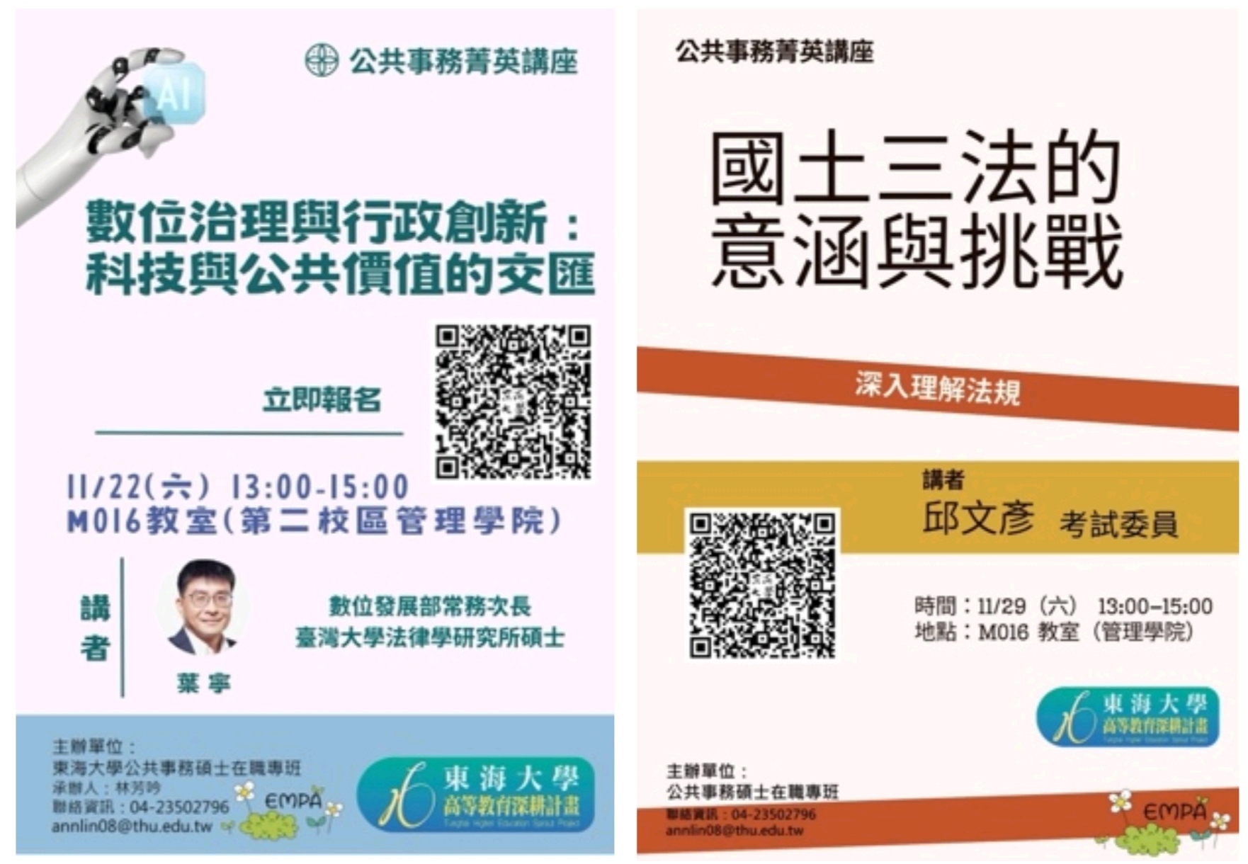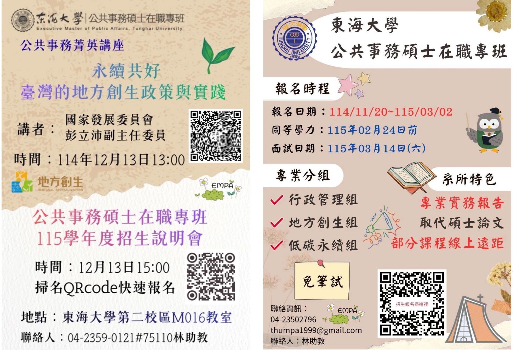 為增加各界對東海大學公共事務在職專班的認識,陳秋政主任除持續在12月13日下午1點辦理菁英講座,邀請國家發展委員會彭立沛副主委,以「永續共好」為題,針對臺灣地方創生政策的規劃與實踐提出分享後,同時在講座之後接續辦理115年度招生說明會,歡迎有興趣講座或學習資訊的各位報名與會。