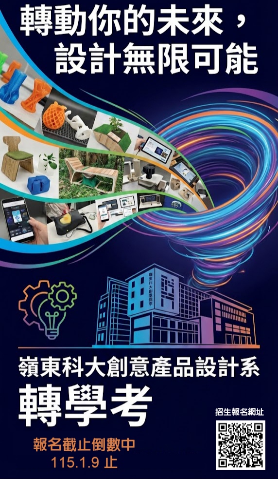 無論是有志於產品開發、設計創新或文化設計實務的學子,嶺東科技大學創意產品設計系均提供全面而實務導向的學習環境,協助學生發展設計專業、拓展就業機會,並透過校內外資源支持,邁向跨域與國際舞台, 轉學報名截止日期為115 年 1 月 9 日,歡迎有志從事設計的學子踴躍報名。