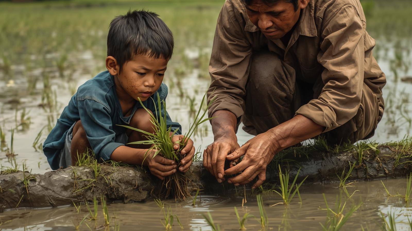孩子蹲在田邊,手裡捧著剛拔起來的稻苗,滿臉泥巴;一旁的長者彎著腰,耐心地教他怎麼把根部理齊、怎麼輕輕放進水裡。孩子聽得專注,長者的眼神溫柔而安定。