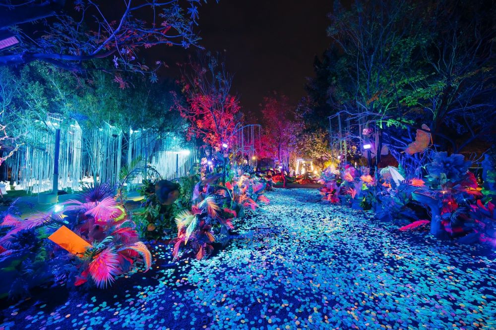 遊程由氣勢磅礴的主題裝置「馬首引領」揭開序幕,遊客踏入綠光流轉的神秘森林,燈影在樹梢與林間游移,彷彿瞬間穿越至遠古雨林。耳畔傳來鳥鳴、獸吼與風聲交織的聲景,春雷乍響,大地甦醒,萬物在夜色中悄然復活。行進之間,林深處忽現一艘遺世獨立的擱淺船骸「綠舟棲地」,引領人們展開對文明與自然的無限想像。
