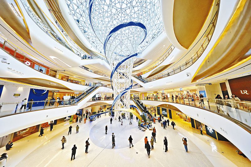 灣里分為商場、汀雲小鎮、諾嵐酒店三大板塊,涵蓋300餘間特色客房、500餘個品牌店舖。商場內,主理人店舖、區域首店、旗艦店等特色店舖紛紛亮相,富有藝術感和設計感的場景也很「吸睛」,隨手一拍就很出片。商場的三大中庭——光影之境、懸水之境、穹宇之境氣勢不凡,瀑布水流從30多米高處傾瀉而下,光影交織的夢幻感讓人們紛紛駐足欣賞。