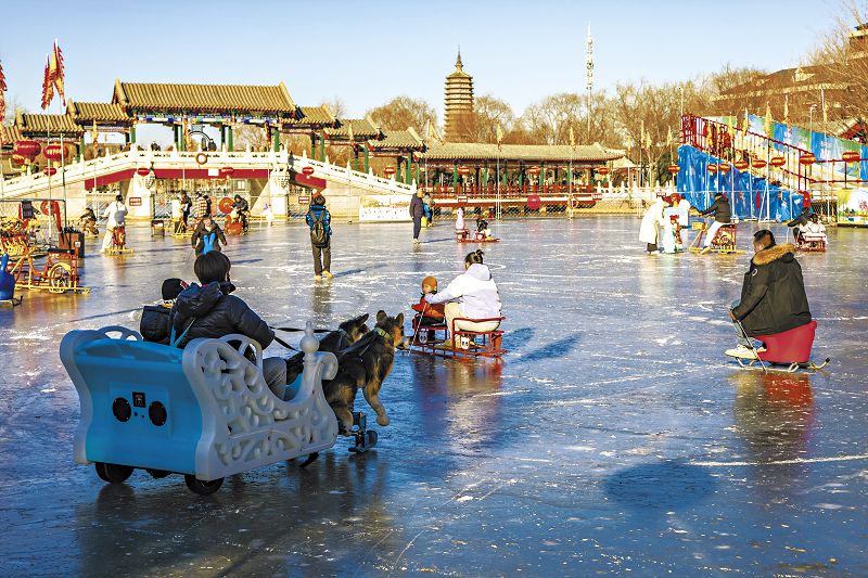 「三九四九冰上走」,冰雪活動正當時。在通州西海子公園,市民在冰面上盡情玩耍,享受冰雪樂趣。(陳啟亮 攝)