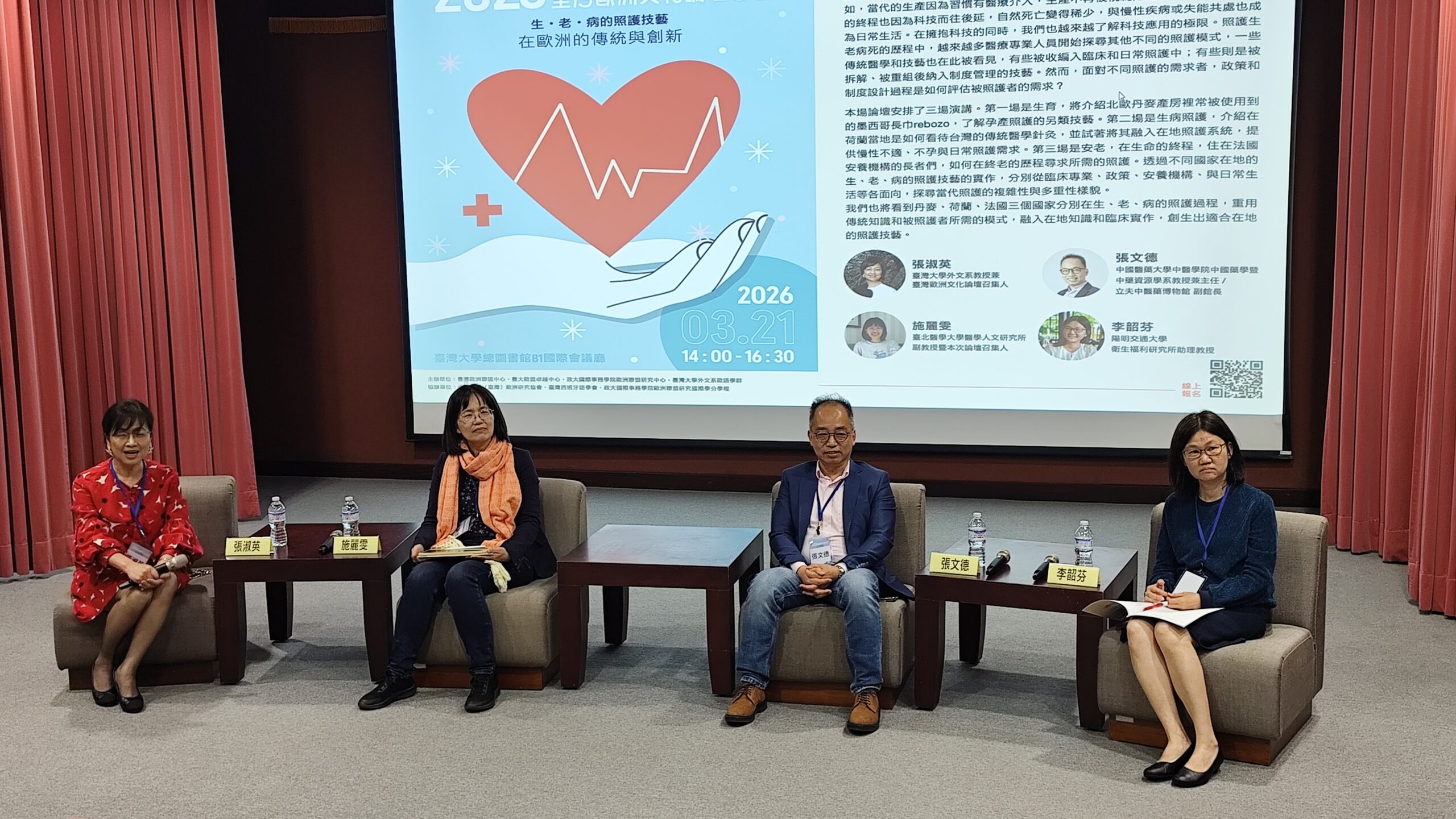 本次論壇邀請多位學者專家齊聚一堂,包括台大外文系教授張淑英、中國醫藥大學教授張文德、台北醫學大學副教授施麗雯、陽明交大助理教授李韶芬等人,分享他們在歐洲與台灣的觀察與研究成果。