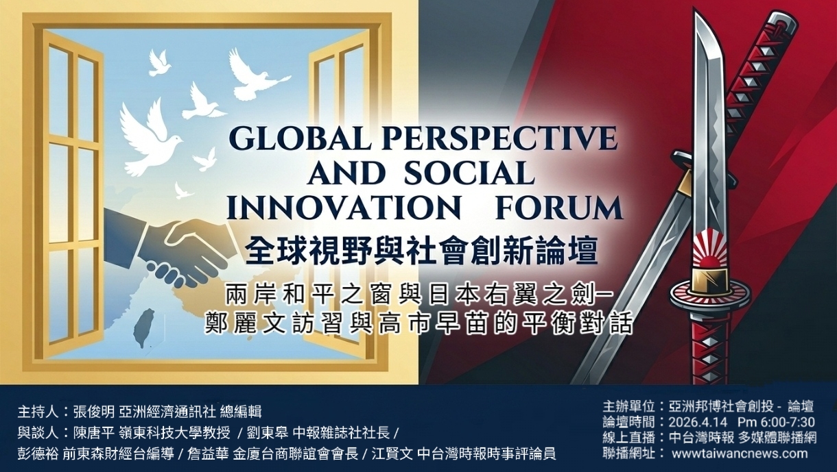 為探討區域局勢對台灣未來的深遠影響,亞洲邦博社會創投 – 論壇主辦;中台灣時報承辦;中社雜誌社、新政財經論壇報協辦《全球視野與社會創新論壇》將於2026年4月14日(星期二)晚上6時網路直播舉行,邀請專家學者,探討與兩岸和平與日本右的平衡對話。