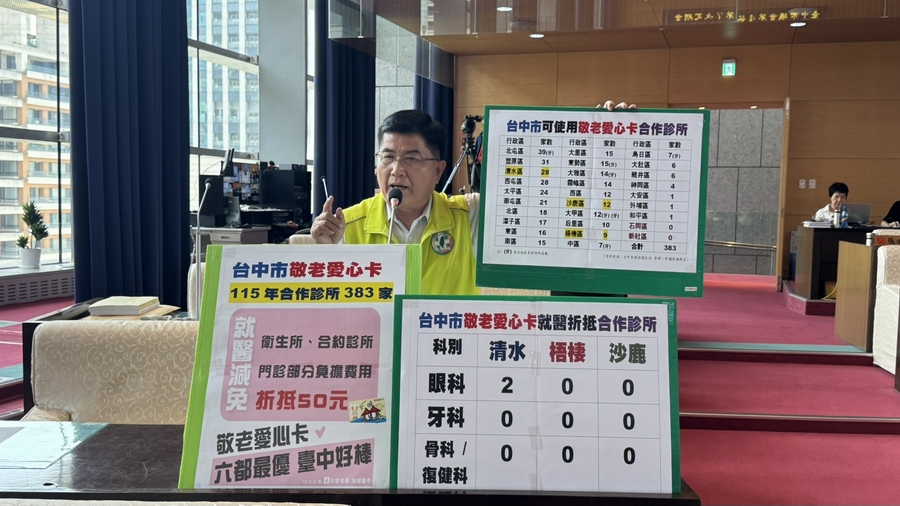 楊典忠最後要求,市府應加強敬老愛心卡合作診所家數,建立每一行政區基本合作診所數量,優先洽詢牙科、眼科、復健科加入,並針對海線與山城提出專案招募計畫,不要讓敬老愛心卡變成「住市區比較好用、住海線比較難用」的冷門卡片。